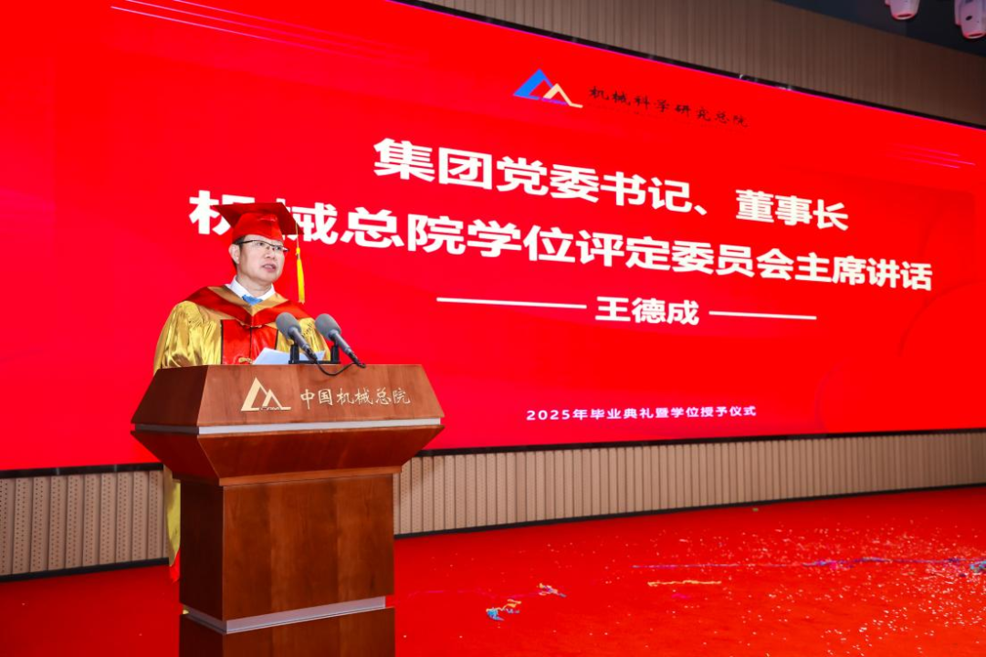 機(jī)械總院學(xué)位評定委員會主席、集團(tuán)黨委書記、董事長王德成,集團(tuán)黨委副書記、總經(jīng)理孟祥宇,集團(tuán)黨委副書記、董事李玉鑫,集團(tuán)黨委委員、副總經(jīng)理王宇,機(jī)械總院學(xué)位評定委員會副主席、集團(tuán)副總經(jīng)理李愛國,集團(tuán)副總經(jīng)理姜超出席典禮,機(jī)械總院學(xué)位評定委員會委員、京內(nèi)外各二級單位領(lǐng)導(dǎo)、導(dǎo)師代表、研究生管理部門負(fù)責(zé)人、2025屆畢業(yè)生及家屬共計190余人齊聚一堂,共同見證這一重要時刻。典禮由機(jī)械總院學(xué)位評定委員會秘書長、研究生院副院長邊翊主持。